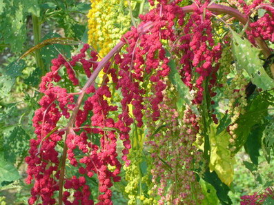 (1)認識紅蔾(djulis)紅蔾(djulis)生長中千變萬化,從嫩綠到綠→鮮綠→鮮紅→暗紫→金黃→到夕陽紅,成植株高度大約150公分到200公分,對環境的適應性頗高,在亞熱帶地一年四季均可生長。其生長時間,播種至採收在台灣海拔800公尺以下,大約需4個月,在海拔高度800公尺以上,則為6個月。紅蔾(djulis)成熟時,由紫見黃轉紅。在台灣許多花藝工作者,都喜歡將紅蔾(djulis)的穗果及株莖,當做插花佈置的素材。近年來國內所辦的花藝觀賞或競賽活動中,就有紅蔾(djulis)的出現。紅蔾(djulis)是原住民自古傳統主食之一,種植採收都必須配合祭儀,方能續進行相關農事以及煮食。紅蔾(djulis)可以配山野菜煮食,通常也與小米混合煮, 紅蔾(djulis)亦可釀酒,也是製作小米酒的媒物。採收時期談情青年到女方家時,喜以色採繽紛的紅蔾為頭飾顯出耀眼光采,增添談天說地時之悅人氣氛。(2)下列報導取至2008-05-23 中央社╱中央社屏東科技大學森林系教授郭耀綸五年來研究台灣原住民使用上百年的作物─紅藜,發現具有非常高的營養價值,值得推廣,於是與食品系合作開發紅藜產品,今天舉辦紅藜推廣研習會,讓民眾認識紅藜,以提高紅藜的市場價值。五年前森林系有一名研究生對民族植物有興趣,發現紅藜具有非常高的營養價植,於是郭耀綸開始指導系上學生在學校裡種植紅藜,進行紅藜的研究和品質改良,希望能推廣這項健康食品,也希望能幫助原住民創造經濟,他還請來屏東縣春日鄉的原住民到學校指導學生種植紅藜。郭耀綸說,台灣目前只有屏東縣和東部的原住民有種植紅藜,以屏東縣的排灣族和魯凱族使用最多,其中以三地門地門鄉使用率最高,除了用來釀製小米酒外,也用來當主食、插花及做頭飾。郭耀綸表示,紅藜的營養價值極高,它的膳食纖維是地瓜的五倍,優於大部份的穀類,膳食纖維可以降低膽固醇、改善糖尿病及抑制大腸癌的發生。最特別的是紅藜具有高量的人體無法自行合成的必需胺基酸,也是稻米等穀類所缺乏,所以可以在米飯中加入紅藜,以彌補必需胺基酸的不足。再者,紅藜的蛋白質比小麥和白米也高。郭耀綸研究也發現,紅藜的莖、葉及花穗主要為紅、橙、黃、紫,主要的色素是甜菜色素,文獻上記載,甜菜色素可治療腸胃、肝障礙、糖尿病、腸抽筋、咳嗽、支氣管疾病和氣喘,並且有很高的抗氧化能力和抑制腫瘤效果。郭耀綸與屏科大食品系教授蔡碧仁及高雄大學葛孟杰教授合作,開發紅藜食品,除了傳統的原住民小米酒外,還有紅藜飲料、餅乾、爆米花、飯糰及麵包等。紅藜也是插花的高級花材,一支紅藜穗價格是一百元。由於紅藜具有極高的經濟價值,但原住民除了釀小米酒外,只有延襲傳統的運用方式,沒有對外推廣,今天,郭耀綸舉辦紅藜的推廣研習會,邀請屏東縣原住民鄉鎮的代表參加,會中邀請蔡碧仁和葛孟杰介紹紅藜的營養價值及食品的開發,同時現場品嚐紅藜食品。